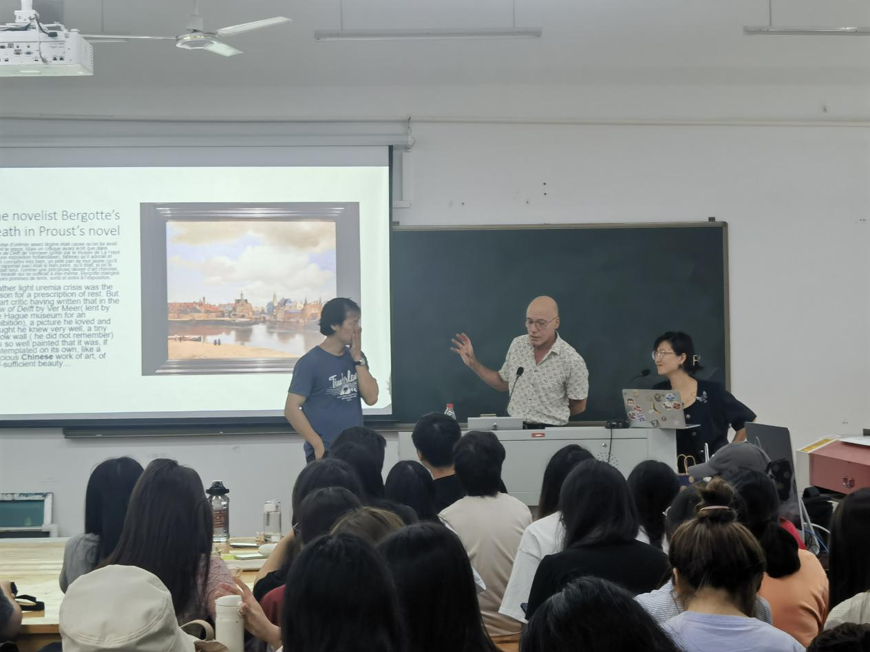 首先,韦浩院长代表学院对各位专家的到来表示热烈的欢迎。接着,弗朗索瓦丝·巴琪安瑟琪教授做了题为《文化创意产业中文化物的符号性》的主题报告。她从联合国教科文组织对于文化创意城市在全球的布局开始,详尽的介绍了世界文化创意产业的内涵和发展演变,并通过符号与象征对文化创意产业做出了自己的解读。马克·帕奎恩教授以《追忆似水流年——普鲁斯特与法国艺术》为题做报告。他通过介绍普鲁斯特与法国艺术的相互影响,呼吁大家以交叉学科研究的方法来提升文化创意产业中设计的内涵与外延。郭倩博士在全程翻译的同时,进行了专业、精彩的解读。最后,在场学生与三位学者进行了热烈的互动。