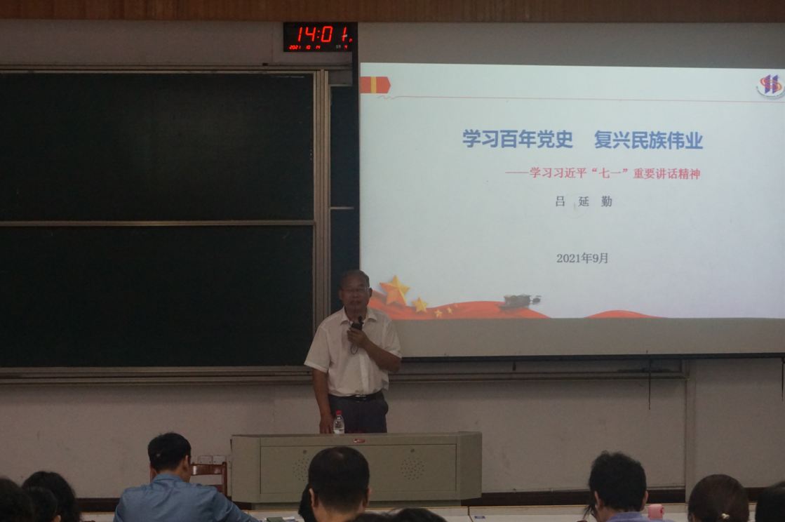 吕延勤以《学习百年党史 复兴民族伟业》为主题,从重要讲话精神的丰富内涵;实现中华民族伟大复兴是中国共产党百年来的主题;七一讲话的新思想、新观点、新论断;如何总结党的基本经验四个方面进行了解读,深刻阐述了党的奋斗历程、客观总结了历史经验。他指出,习近平总书记“七一”重要讲话立足中国共产党百年华诞的重大时刻和“两个一百年”历史交汇的关键节点,回望光辉历史、擘画光明未来,具有重大的政治意义、历史意义、时代意义和现实意义,学院全体教师要切实提高政治站位,把学习贯彻习近平总书记“七一”重要讲话精神作为当前和今后一个时期的重大政治任务,铭记光荣历史,坚定信仰信念,汲取奋斗力量。