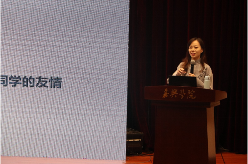 简短的自我介绍之后,刘洋老师开门见山地从生活环境、学习环境、人际环境、语言环境、经济环境五个方面列举了大学生活与高中生活的不同之处,围绕高校新生的常见心理问题,巧妙运用生动形象的事例阐释心理健康知识,用诙谐幽默的语言紧抓全场同学的注意力。最后,通过一段8分钟的视频短片带同学们更深入了解了嘉兴学院心理健康中心的基本情况和预约方式。