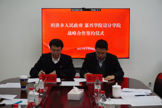 坦洪乡党委书记潘军宝介绍了坦洪乡的风土人情、资源优势和人文优势,并表示双方合作共建内容不限于艺术乡建领域的设计指导,更在于加强党建、团建领域合作,协助开展师生艺术采风和社会实践。坦洪乡乡长徐旭达与学院各系主任、教授交流了校地合作的具体项目内容。最后,徐旭达与韦浩分别代表双方签署共建协议。