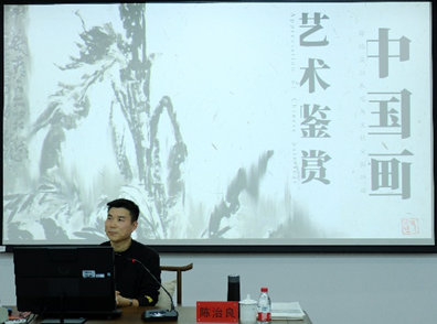 本次交流活动以《中国画艺术鉴赏》为主题,陈老师从岩画为始,选取中国历代经典水墨作品溯源中国画的发展和演变,用山水花鸟意象的细节深挖工笔与写意的区别与内涵。此外,陈老师还以“兰草”和“墨梅”为主题,通过现场实践教学的直观方式,为同学们演示笔墨技法的应用,在场的同学被深深吸引,皆目不转睛的围绕一旁。“陈老师实践教学时胸有成竹的样子一定是建立在其深厚的国画功力上的,他倾囊相授、无私的教学态度令人敬佩,这次讲座收获太大了。”刘文乐同学感慨道。