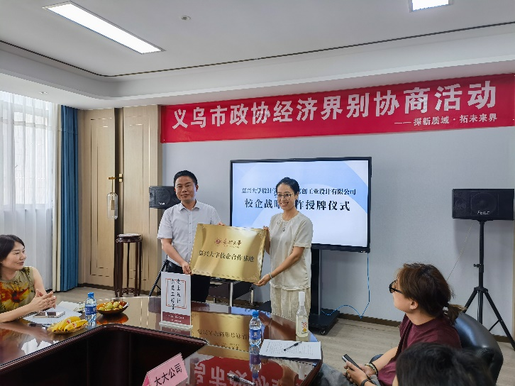在义乌市大大箱包材料有限公司会议室,蒋建其一行与义乌市财政局、经信局、科技局领导、义乌市政协经济界别委员、相关企业代表、行业协会负责人等围绕“探新质域.拓未来界”主题,就校企地产学研深度合作、人才联合培养、技术成果转移转化、学生实习就业等话题进行了充分交流。特别就如何开展可持续的有效合作、如何推进项目落地等问题进行了深入研讨。期间,举行了校企合作授牌仪式,蒋建其代表伟德bv国际体育向义乌嘉创工业设计有限公司总经理陈飘授牌。
