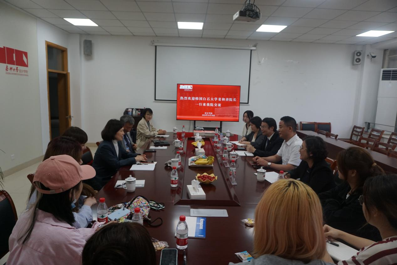 座谈会上,韦浩院长对姜和善院长一行的到来表示热烈的欢迎,介绍了嘉兴大学的基本情况、国际合作交流的现状和中韩交流交换生项目、双学位项目的目的和意义,强调增加双方文化艺术交流的重要性。姜和善院长介绍了白石大学的情况和该校在国际教育交流方面的经验和成就,向参加座谈的同学们介绍了有关交换生语言能力选拔标准及白石大学奖学金政策、韩国的生活、学习环境等。
