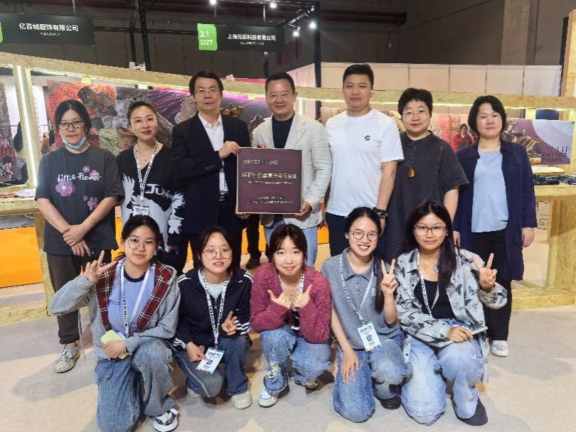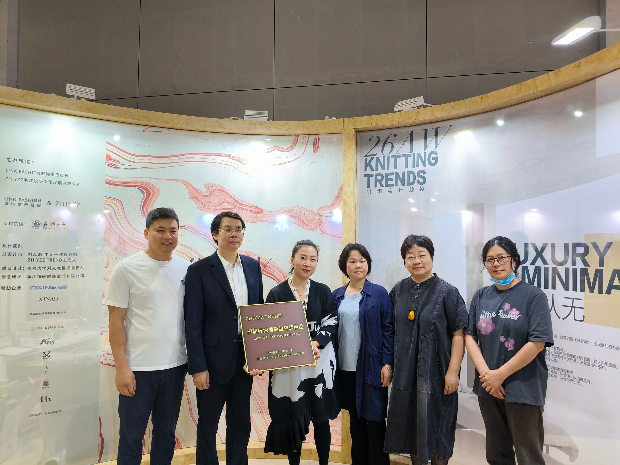 伟德bv国际体育刘文教授项目团队与中国十佳设计师、ZHIYZZ TREND主理人刘彦君女士共同策划的针织流行趋势展在2.1馆K50区精彩亮相。伟德bv国际体育院长韦浩、副院长裘玉英一行到展会参观展出,并与合作单位负责人共同为“织研针织垂直趋势项目组”揭牌。