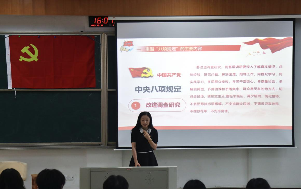 活动在全体毕业生党员共唱国歌的庄严氛围中拉开序幕。徐蓉从中央八项规定精神实质为切入点,结合年轻干部违规违纪的典型案例深入剖析了违反中央八项规定精神具体表现和深层次原因,她希望毕业生党员们能始终牢记初心使命,严守纪法规矩,锤炼忠诚品格,在大是大非上旗帜鲜明、站稳立场,在小事小节上律己修身、守住底线,在履职尽责上恪尽职守、勤勉进取,始终做到忠诚干净担当,让青春在“强国有我”实践中绽放绚丽之花。