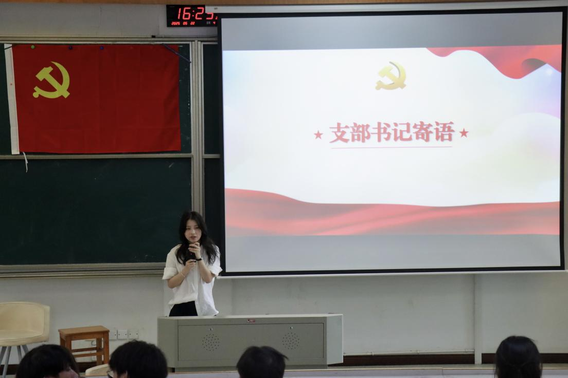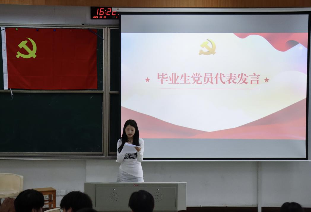省级优秀毕业生黄汝杏同学作为毕业生党员代表,结合自身大学期间的学习、实践经历,分享了作为党员在思想、学习、工作中的成长体会。学生支部书记们也为毕业生党员送上了深情的寄语。他们希望毕业生党员在今后的工作和生活中,牢记党员身份,坚定理想信念,勇于担当作为。颜姚炜老师对毕业生党组织关系转接的政策和具体流程进行了解读,提醒党员们务必高度重视转接工作,确保组织生活的连续性与稳定性。最后,全体毕业生党员面向党旗庄严高举右拳,重温入党誓词。