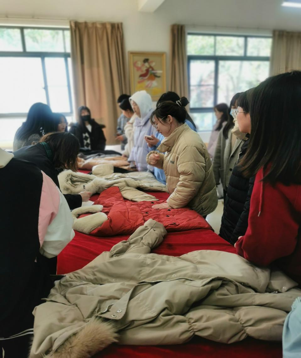 本次活动的供应商——嘉兴三冠服饰有限公司带来了十余件各种款式的羽绒服以及运动裤以供同学们挑选试穿。同学们经过精心挑选后都选出了自己满意的服装,现场气氛热烈、温馨。