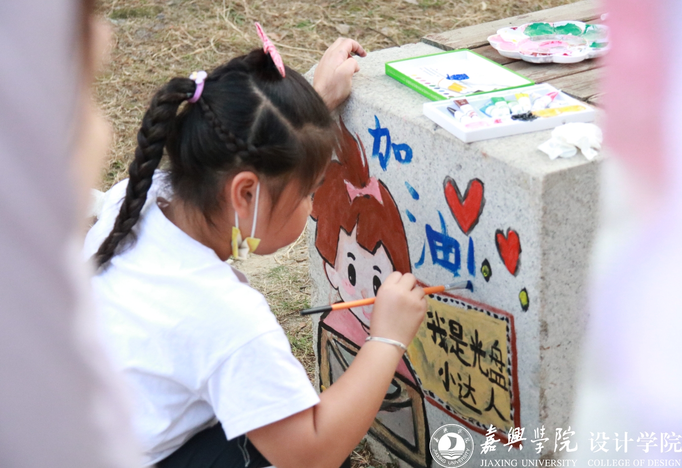 简单的自我介绍后,小朋友们放下拘谨,很快和志愿者们熟络起来。在志愿者哥哥姐姐们手把手的指导下,小朋友们用画笔在社区各个显眼的区域完成光盘行动、垃圾分类、节约用水、防诈反诈、交通安全、家风家训六大主题创作。李佳怡小朋友通过卡通人物倡导大家做“光盘小达人”,在完成画作后,她意犹未尽地题写“加油”二字,是在鼓励自己,也是在号召所有小伙伴付诸行动。除了主题作品外,小朋友们还即兴完成了许多卡通人物形象创作,为社区的角落增添一抹俏皮的色彩。刘嘉莉小朋友绘制完成了尊老爱幼主题画作后骄傲地说“晚上我一定要带爸爸妈妈来看我的作品”。